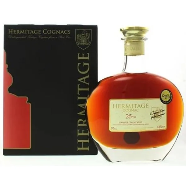 קוניאק הרמיטאז' גראנד שמפיין 25 שנים (Cognac Hermitage Grande Champagne 25 Years) הוא קוניאק צרפתי מיושן מאזור Grande Champagne, הנחשב לאזור האיכותי והיוקרתי ביותר בעולם הקוניאק. הקוניאק מבית Hermitage מיוצר מזני ענבים לבנים מסורתיים של האזור, ועובר יישון ארוך בחביות עץ אלון צרפתי במשך רבע מאה, מה שמעניק לו מבנה עמוק, מורכבות ארומטית גבוהה ואיזון מדויק בין פרי, עץ ותבלין.